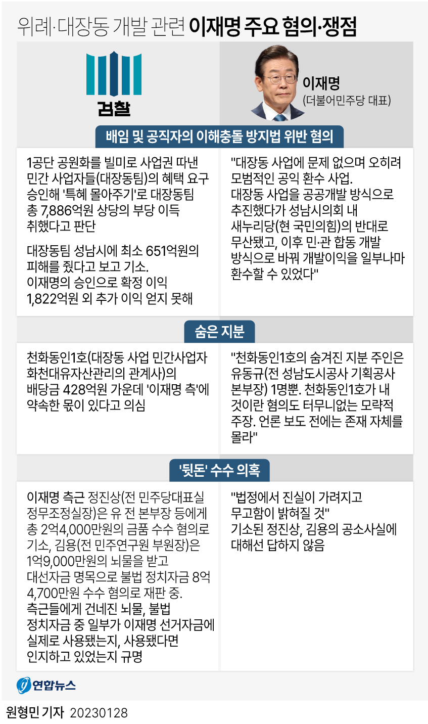 이 대표는 현재 대장동 개발사업 특혜 의혹, 성남 FC 후원금 유용 의혹, 공직선거법 위반 사건 등으로 이미 재판을 받고 있는 상황입니다.