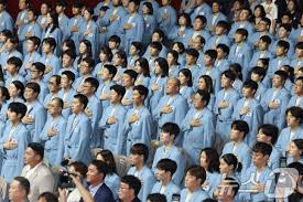 공개된 단복 디자인은 한국 전통 문양을 현대적으로 재해석한 디자인이 특징입니다. 밝은 파란색 바탕에 흰색과 노란색으로 국화 문양이 그려져 있습니다.